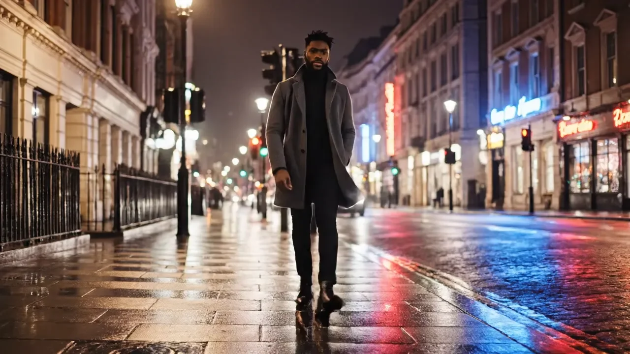 a handsome, confident man walking calmly through a london street at night. stylish modern outfit, tailored coat, clean boots, elegant posture. soft city lights reflect on wet pavement, iconic london street lamps glowing warmly. subtle neon signs and passing headlights create cinematic bokeh. slow, steady walk with natural movement, relaxed expression, quiet confidence. light wind gently moving his coat. cinematic night lighting, deep contrast, moody atmosphere, shallow depth of field. ultra-realistic motion, smooth camera tracking from the front, slow cinematic pace, aesthetic urban vibe, prem